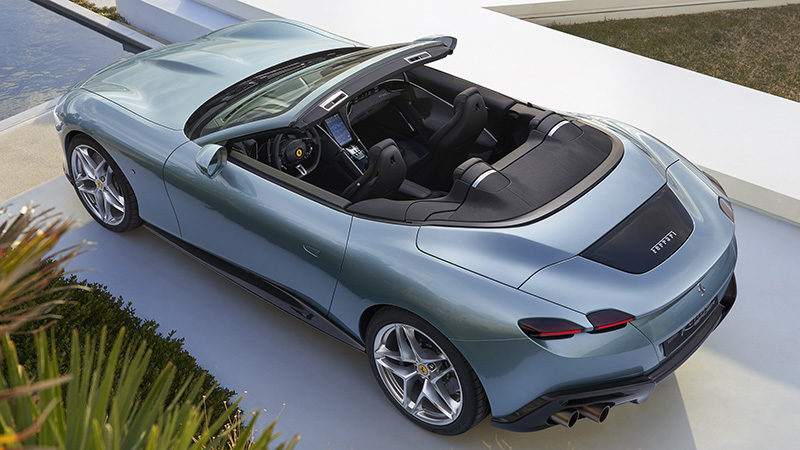 El frontal del Roma Spider presenta una parrilla más prominente, con la famosa «cavallino rampante» destacándose en el centro. Los faros de LED, finamente diseñados, le otorgan una mirada afilada y moderna, mientras que la zaga muestra un diseño minimalista pero de fuerte carácter, con un difusor de aire envolvente que mejora tanto la estética como la aerodinámica del coche.