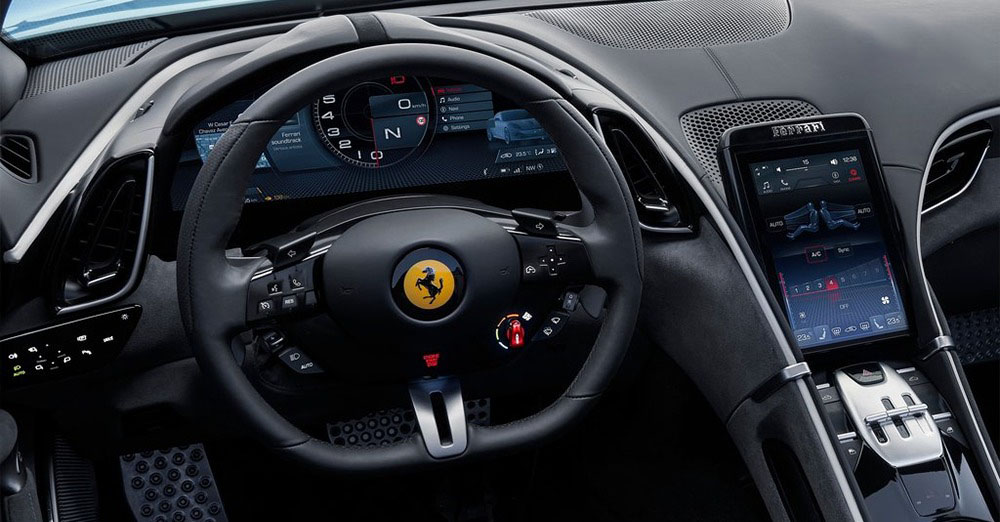 El interior del Ferrari Roma Spider es un testimonio de la elegancia italiana y la modernidad tecnológica. La cabina se presenta con materiales de primera calidad, como cuero de alta gama, detalles en fibra de carbono y acabados metálicos que reflejan el lujo en cada rincón. La pantalla digital curva de 16 pulgadas frente al conductor es una de las grandes innovaciones del modelo, ofreciendo toda la información necesaria de manera intuitiva.