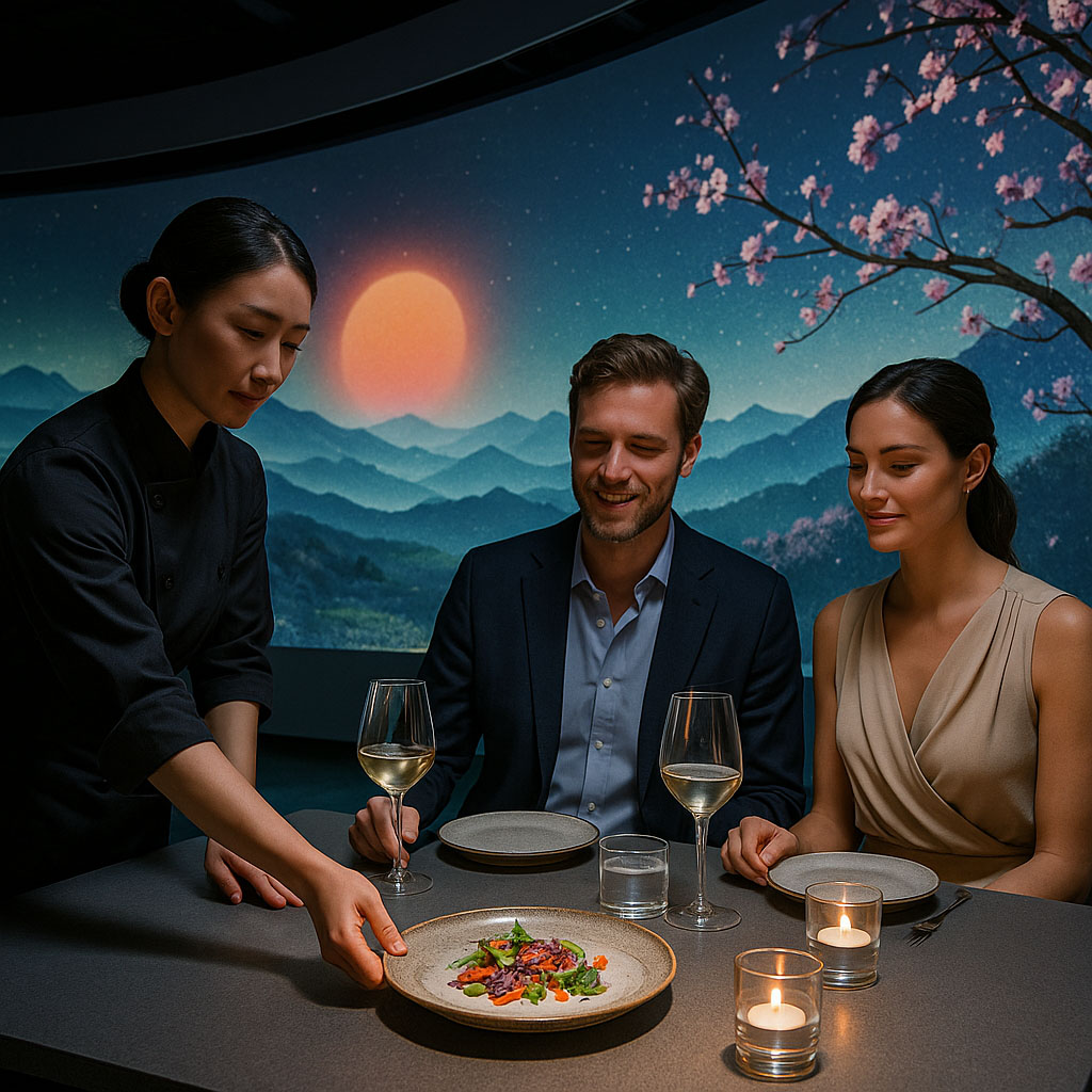 La alta gastronomía ha dejado de ser únicamente una cuestión de sabores para convertirse en un espectáculo multisensorial. Los restaurantes más exclusivos del momento están apostando por la fusión entre arte, tecnología y cocina. Ejemplo de ello son los restaurantes inmersivos en Dubái y Tokio, donde se emplea realidad aumentada y proyecciones 3D para elevar la experiencia gastronómica a otro nivel.